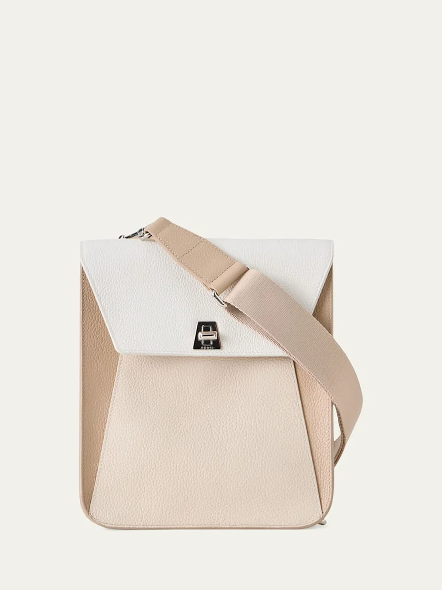 Akris messenger bag in napa calf leather Detachable, adjustable web shoulder strap Flap top with turnlock closure Exterior, one back slip pocket and one slip pocket under flap Approx. 7.7"H x 9.5"W x 2.3"D "Anouk" is made in Romania