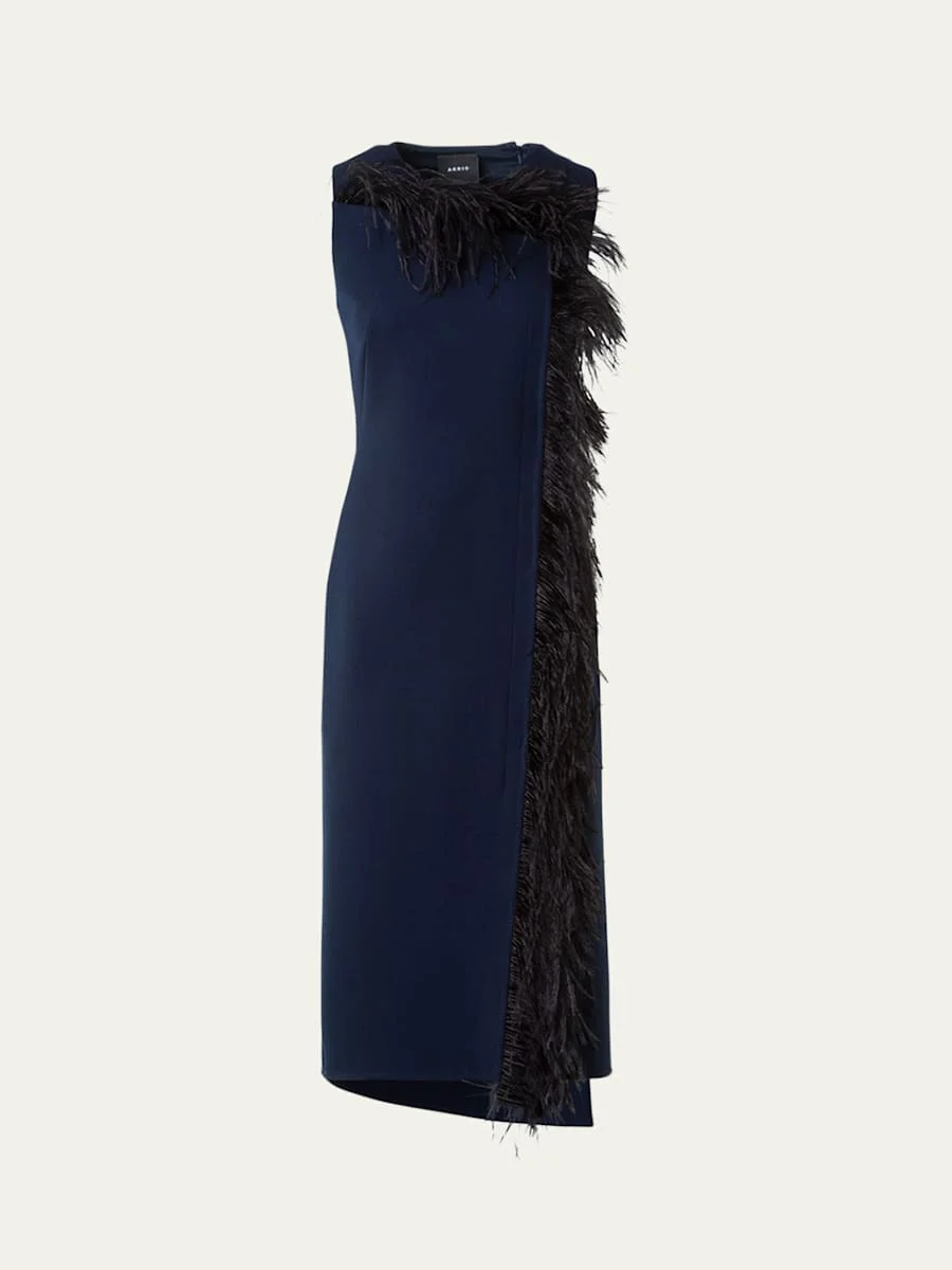Akris stretch doubleface wool midi dress decorated with dyed ostrich feather (Italy) trim Crew neckline Sleeveless Sheath silhouette Hem falls below the knee Zip closure Virgin wool/feather Dry clean Imported