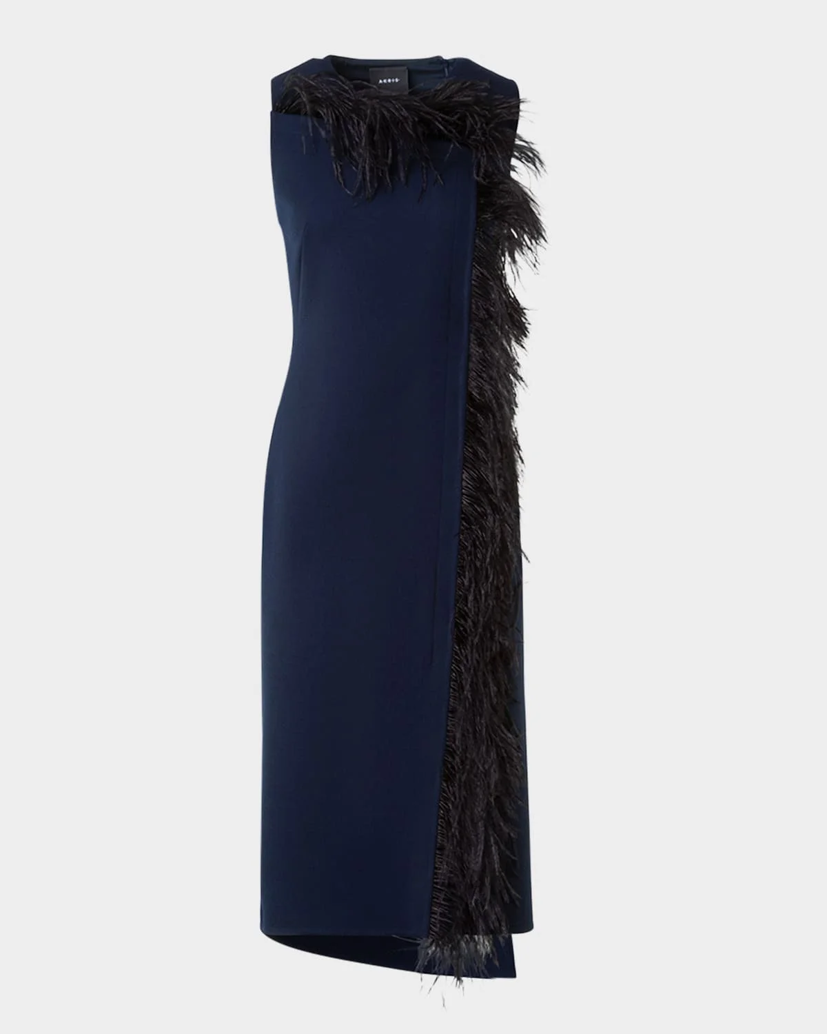 - Akris stretch double-face wool midi dress decorated with dyed ostrich feather (Italy) trim - Crew neckline - Sleeveless - Sheath silhouette - Hem falls below the knee - Zip closure - Virgin wool/feather - Dry clean - Imported