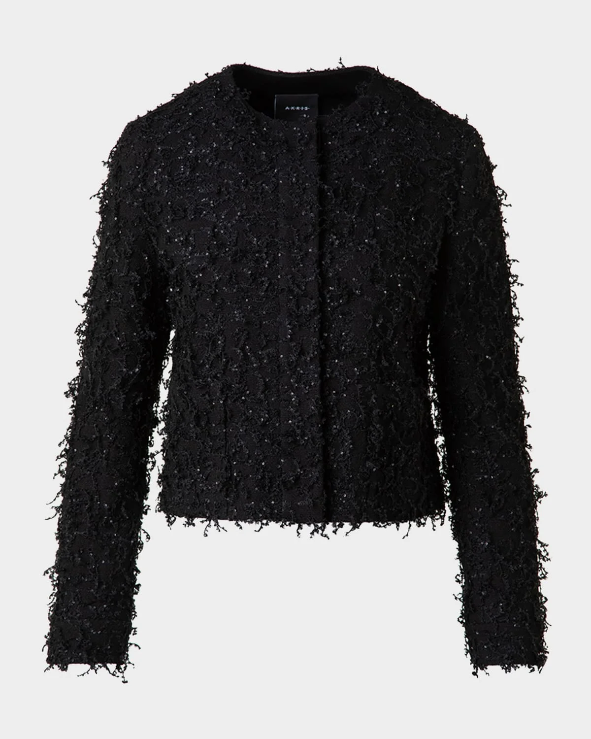 Akris "Bea" collarless shirt jacket in micro sequin fringed boucle Round neckline; concealed singlebreasted front Long sleeves; slit cuffs Straight fit Hip length Nylon/polyamide/viscose/cotton Lining: Silk Dry clean Made in Romania