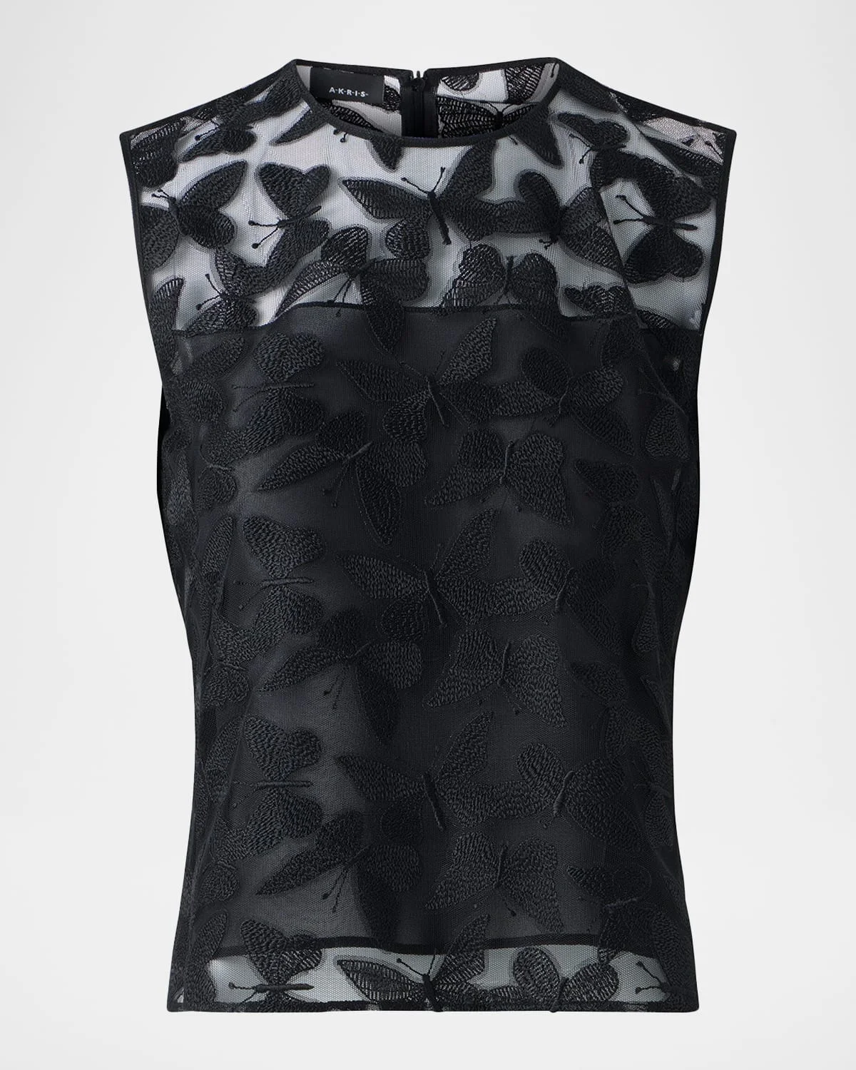 Akris top is crafted of a tulle embroidered with allover delicate butterflies Crew neckline Sleeveless Relaxed fit Back zip Polyester Made in Romania