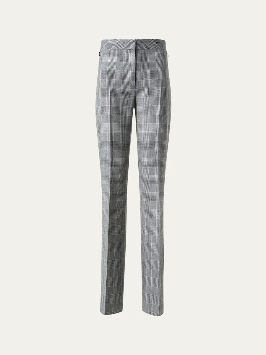 Akris "Carl" pants in Prince of Wales check Mid rise sits high on hip Flat front Slim, straight legs Full length Side zip pockets Hook/zip fly Cashmere Dry clean Made in Romania Online Inquiries: BGS21_B9UE2| Store Inquiries: #4970731