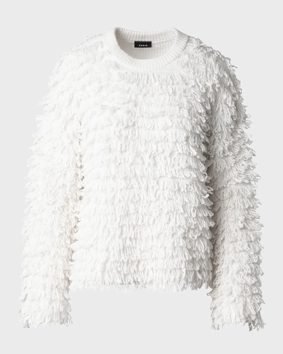 Akris wool and cashmere blend knit sweater features an allover loops textured finish Crew neckline Long sleeves Ribbed trim Hip length Relaxed fit Pullover style Virgin wool/silk/cashmere Dry clean Made in Romania