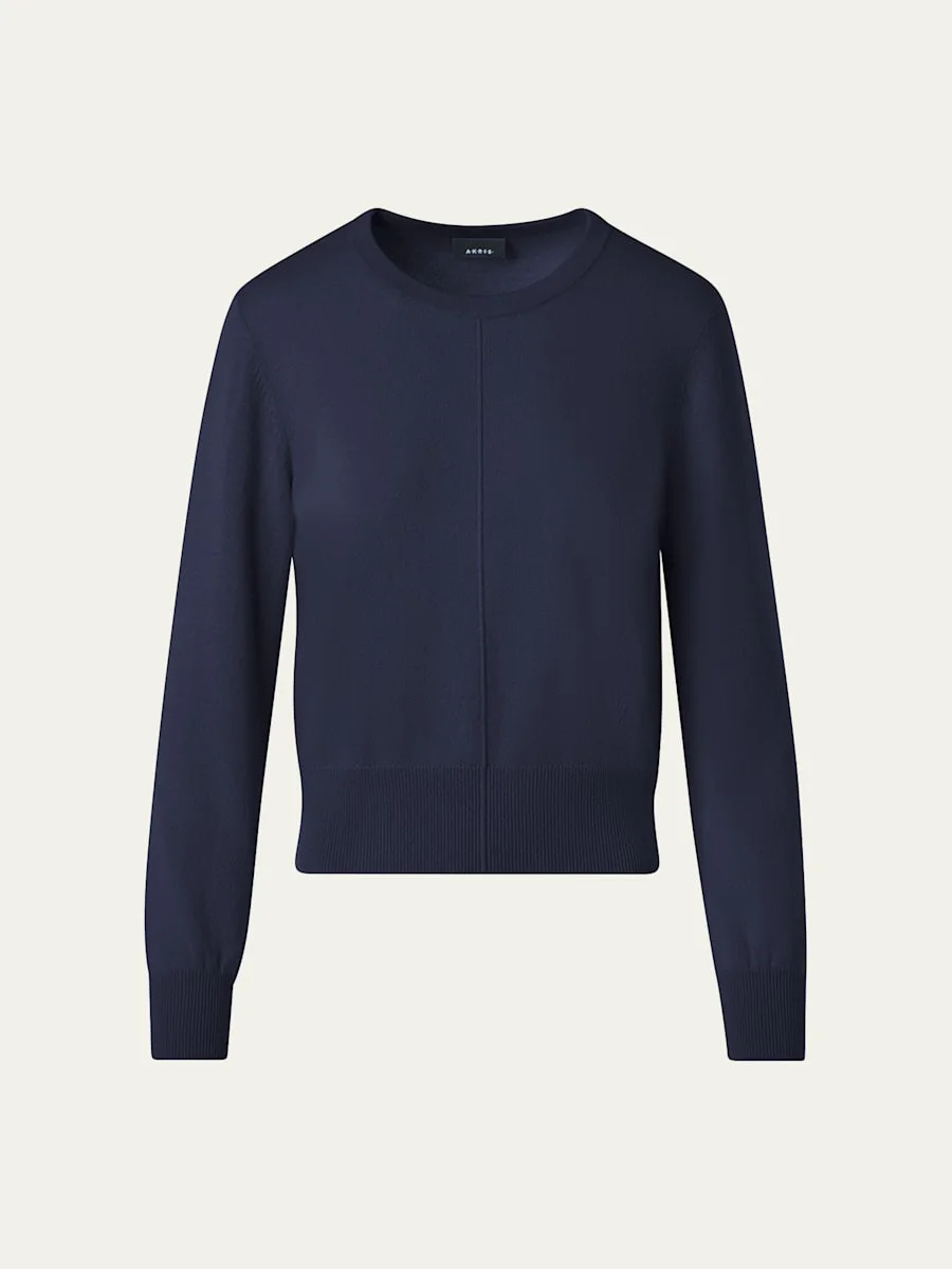 Akris minimalist knit sweater tailored with a central seam Crew neckline Long sleeves Ribbed hem and cuffs Hip length Relaxed fit Pullover style Cashmere Dry clean Made in Romania Online Inquiries: BGS21_BB0AV| Store Inquiries: #5373113