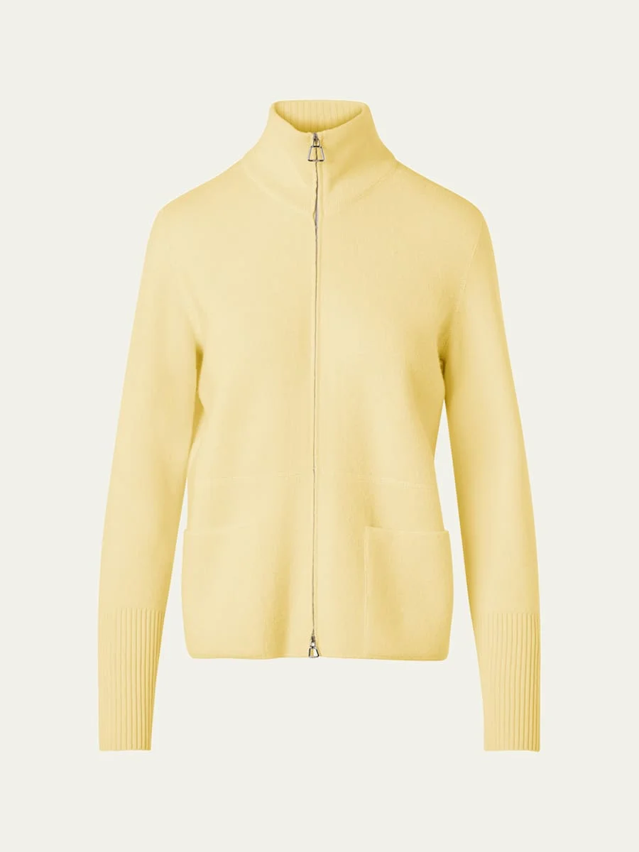 Akris pique knit cardigan sweater framed by ribbed cuffs Stand collar; zip front closure Long sleeves Two front patch pockets Hip length Relaxed fit Cashmere Made in Romania Online Inquiries: BGS21_BAJHL| Store Inquiries: #5166873