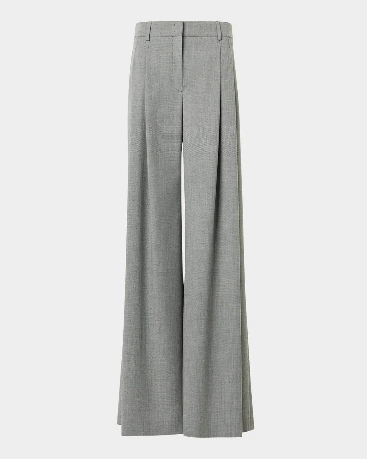 Crafted from wool suiting, the Akris "Cassie" pleated pants embody expert tailoring in a timeless cut Mid rise Side slip pockets Back welt pocket Full length Exaggerated wide legs Hookandbar/zip fly Virgin wool Made in Romania