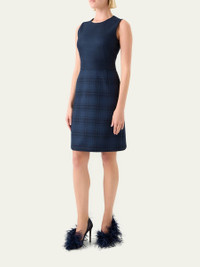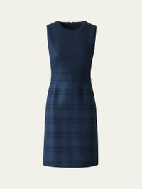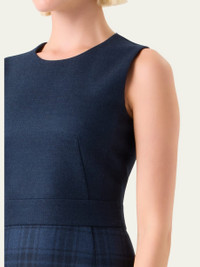 Akris wool double face dress featuring a solid boice and a check skirt Round neckline Sleeveless Knee length Aline silhouette Back zip Virgin wool Lining: Silk/viscose Dry clean Made in Switzerland