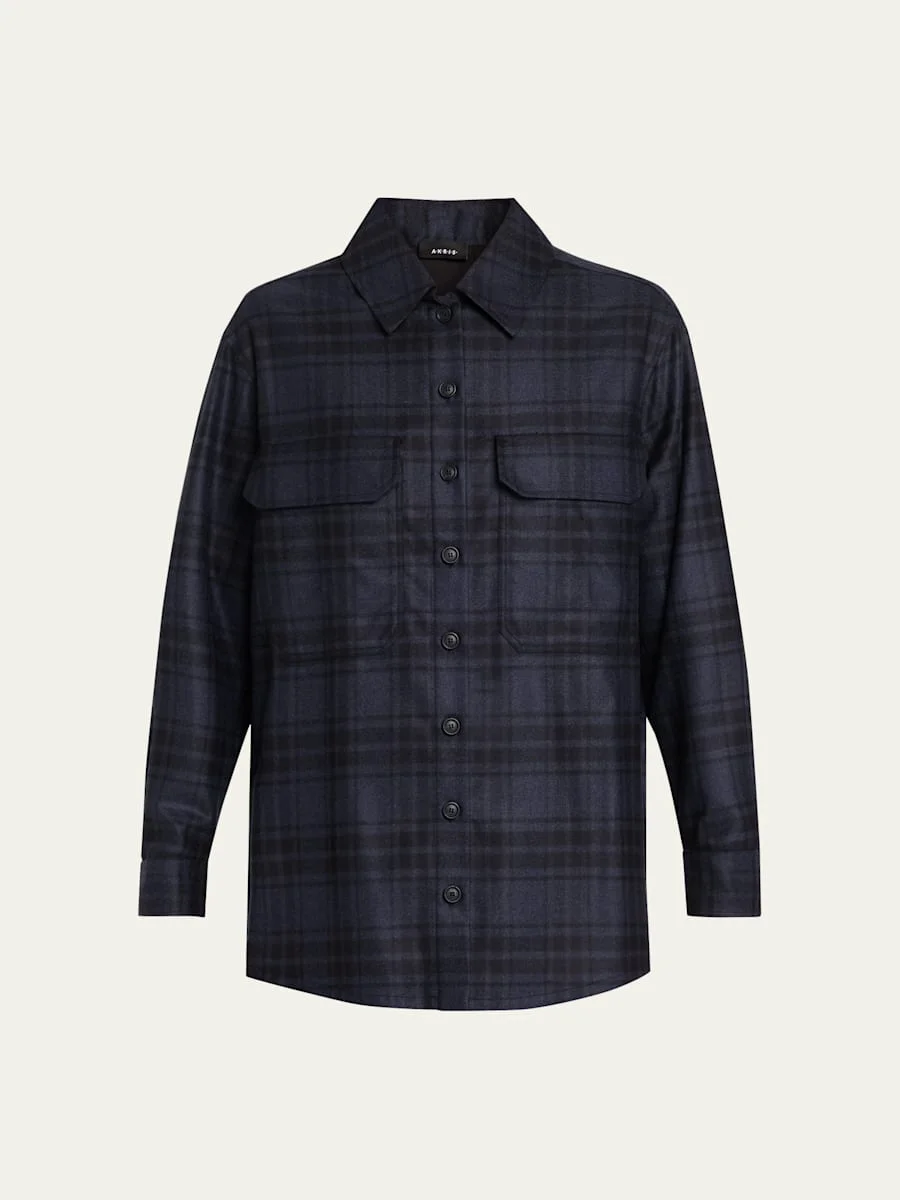 Akris shirt jacket in check wool flannel Point collar; button front Long sleeves; button cuffs Oversized fit Side slits Shirttail hem Wool Dry clean Made in Switzerland Online Inquiries: BGS21_BA26G| Store Inquiries: #5019819