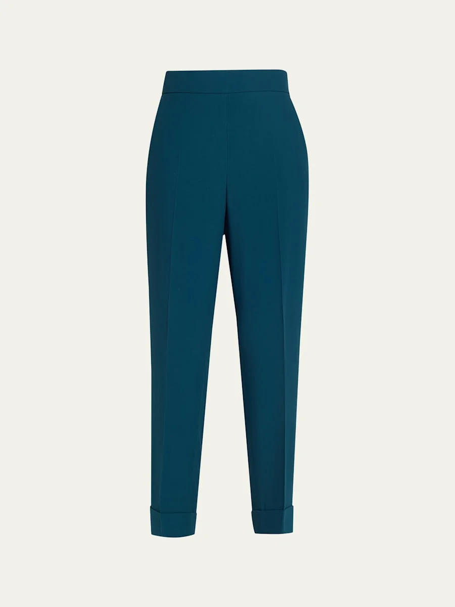 Crafted from cool wool crepe, the "Chris" pants from Akris feature an elasticized back of the waistband and rolled cuffs Mid rise sits high on hip Flat front Angled side slip pockets Tapered legs Cropped at the ankle Rolled cuffs Pullon style Acetate/viscose Lining: Viscose/elastane Dry clean Made in Romania SIZE amp; FITModel measurements: 5'10" tall Model is wearing a US size 4/Small