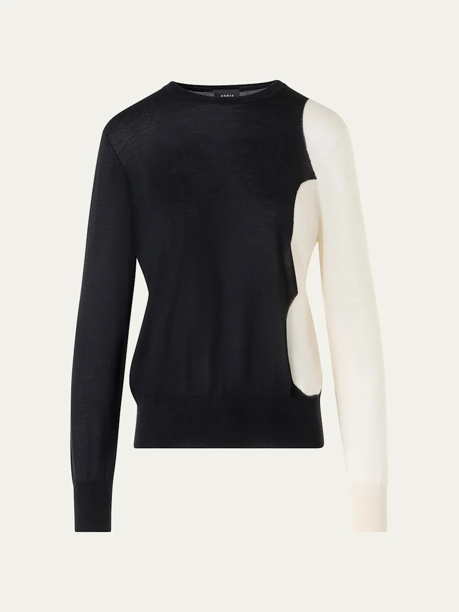 Crafted from lightweight cashmeresilk knit, this sweater from Akris features a colorblock cloud intarsia Crew neckline Long sleeves Relaxed fit Hip length Ribbed cuffs and hem Pullover style Cashmere/silk Dry clean Made in Romania SIZE amp; FITModel measurements: 5'10" tall Model is wearing a US size 4/Small
