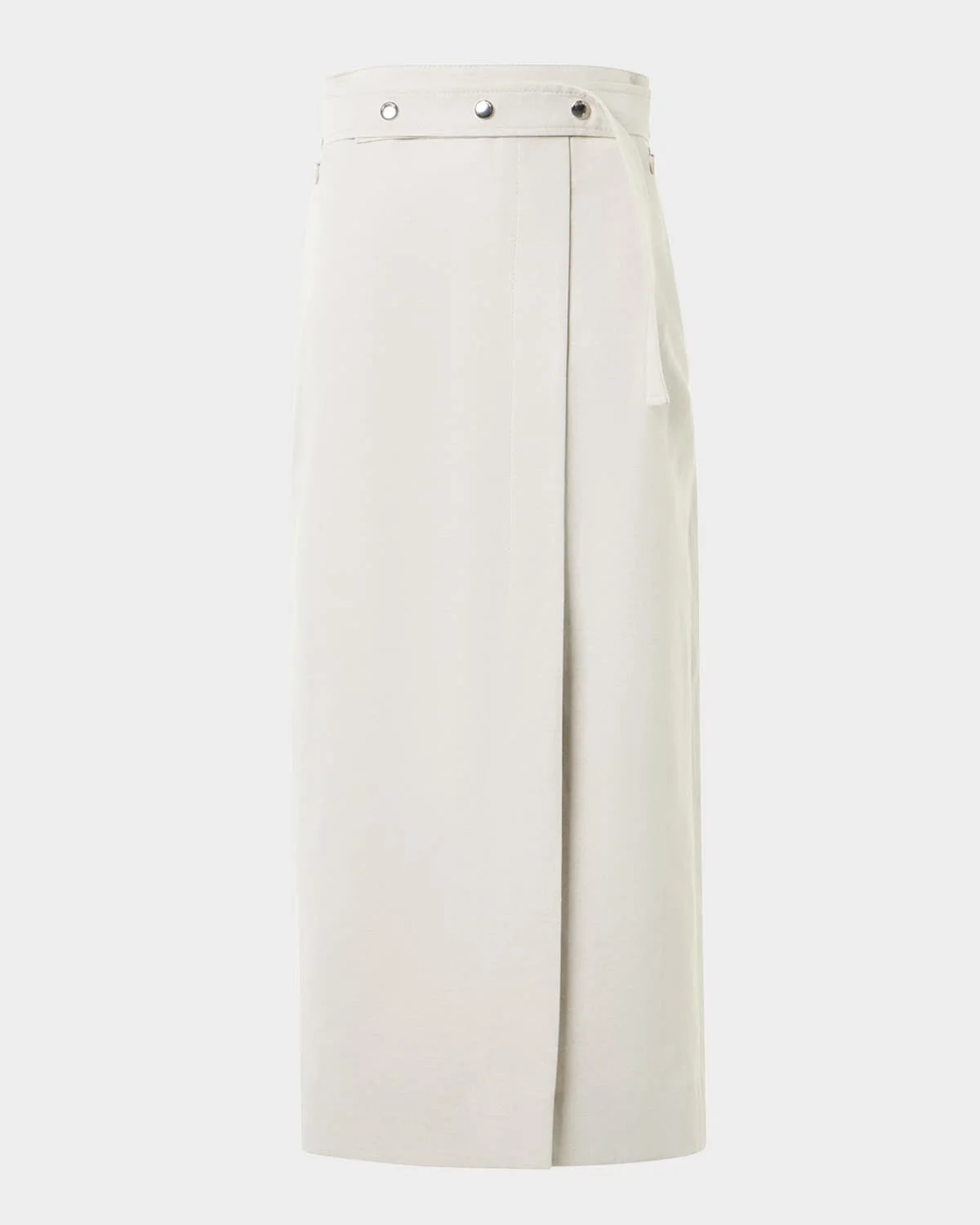 Akris gabardine skirt with a wrap silhouette that balances structure and ease Self belt snaps along the waist and is secured with belt loops Concealed slanted zip pockets Wrap style falls straight from the hip to the hem Hits below the calf Cotton/linen Made in Romania