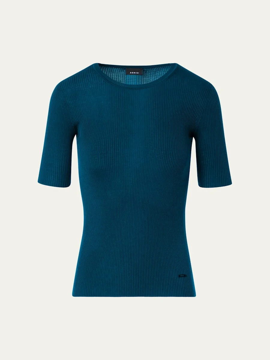 Akris ribbed sweater channels minimalist style with clean lines Crew neckline Short sleeves Hip length Fitted Pullover style Silk/cotton Made in Romania