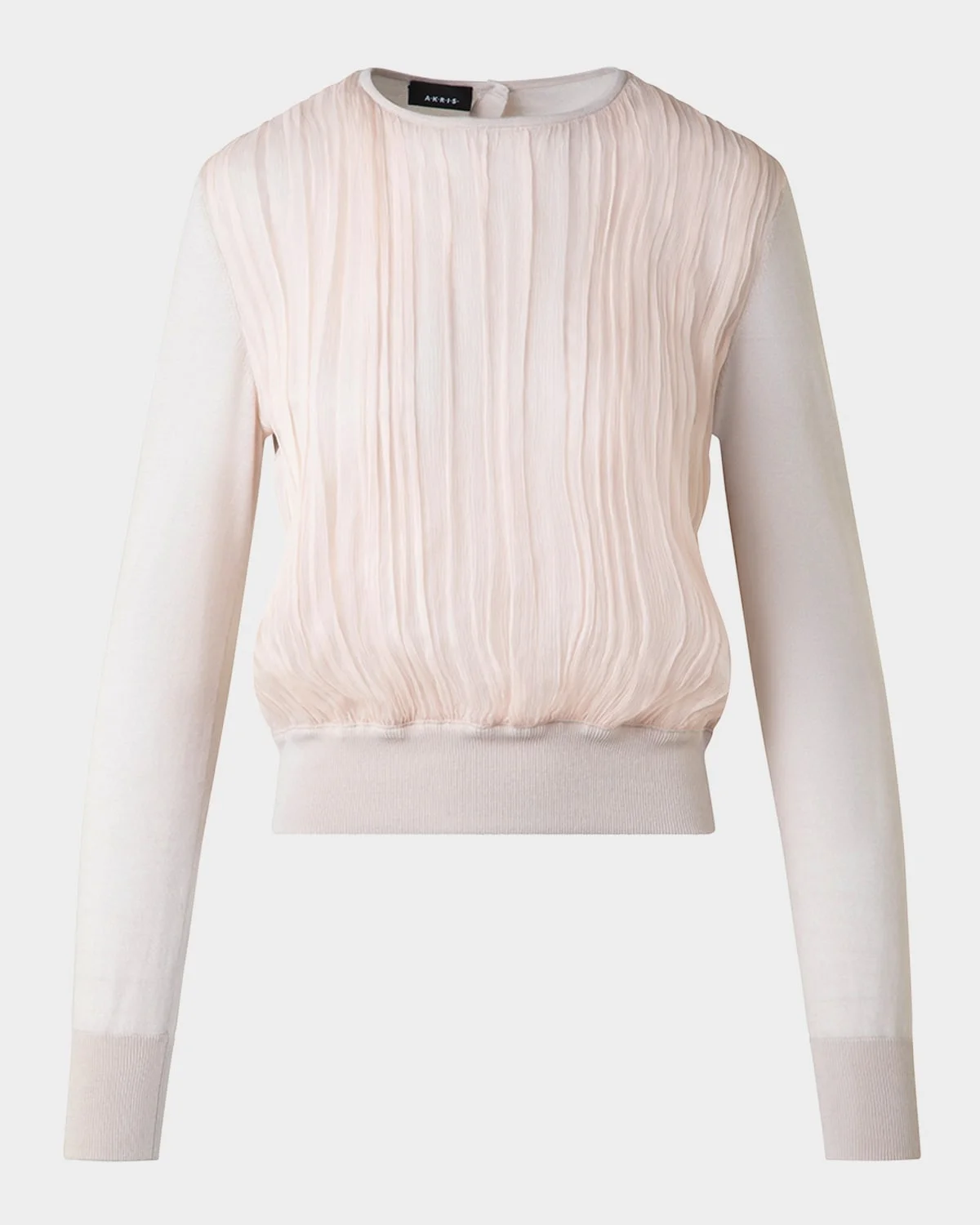 Akris knit sweater with a gathered crinkle silk chiffon front Crew neckline; button back Long sleeves Relaxed fit Ribbed cuffs and hem Pullover style Virgin wool/silk Made in Romania