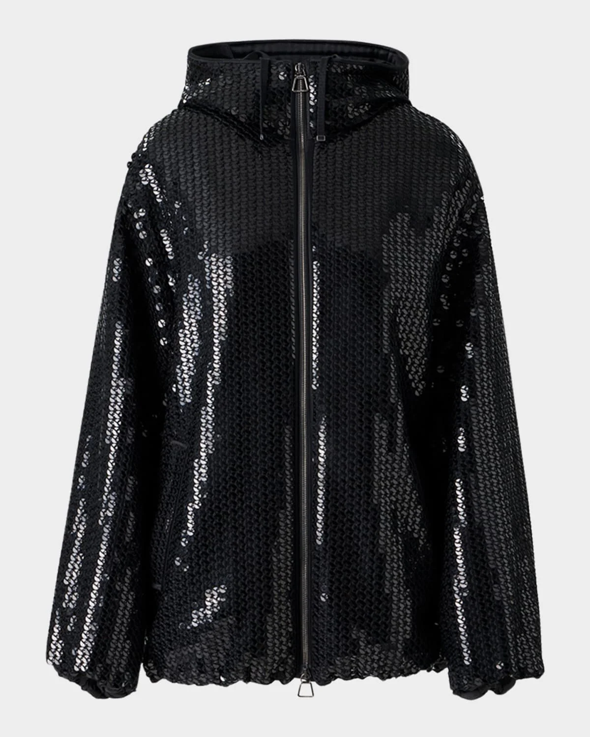 - Akris "Davis" parka jacket in translucent sequin embellished chiffon - Drawstring hooded neckline; two-way zip front - Long sleeves - Hip welt pockets - Relaxed fit - Hip length - Polyester - Dry clean - Made in Switzerland