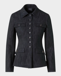 - Akris "Delia" shirt jacket in denim stretch - Point collar; single-breasted front - Long sleeves; slit cuffs - Front button-flap pockets - Fitted - Walking vent back - Cotton/polyurethane - Dry clean - Made in Romania