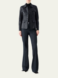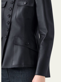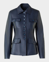 - Akris "Delia" jacket in lamb nappa leather - Point collar; single-breasted front - Long sleeves; unfinished cuffs - Front flap pockets - Slim fit - Center-back vented hem - Button closure - Leather - Lining: Silk - Dry clean - Made in Romania