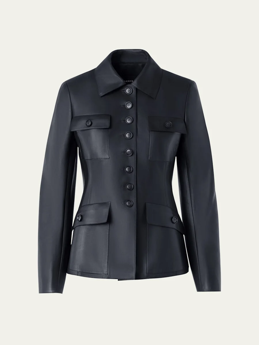 Akris "Delia" jacket in lamb nappa leather Point collar; single-breasted front Long sleeves; unfinished cuffs Front flap pockets Slim fit Center-back vented hem Button closure Leather Lining: Silk Dry clean Made in Romania Online Inquiries: BGS21_BA27A| Store Inquiries: #5019851