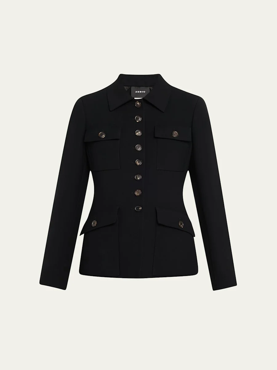 Akris "Delia" jacket in double-face wool Point collar; single-breasted front Long sleeves; slit cuffs Padded shoulders Front button-flap pockets Slim fit Center-back vented hem Virgin wool Lining: Cupro Dry clean Made in Switzerland Online Inquiries: BGS21_B9UEK| Store Inquiries: #4970753