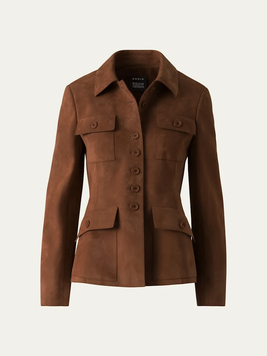 Akris "Delia" utility jacket is crafted of lamb nappa suede tailored with front button flap pockets and a slim silhouette Point collar; singlebreasted front Long sleeves; slit cuffs Padded shoulders Front buttonflap patch pockets Slim fit Hip length Centerback slit hem Button closure Suede Lining: Silk Dry clean Made in Romania
