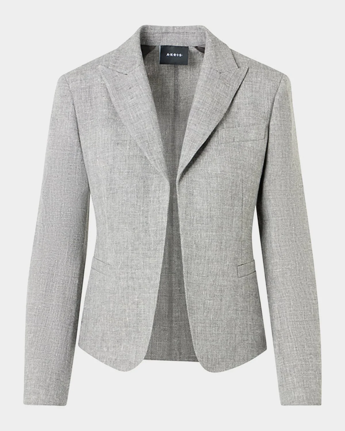 Akris "Deneuve" jacket cut from crisp linen and wool suiting Peak lapels Open front Long sleeves with slit cuffs Chest welt pocket Two side welt pockets Cutaway hem Cropped fit Linen/virgin wool Made in Switzerland