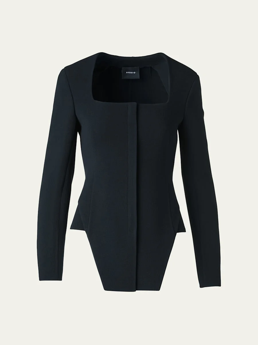 Akris "Desiree" double-face wool trapezoid jacket Square neckline Long sleeves Fitted High-low hem Concealed front zip Wool/elastane Lining: Elastane/silk Dry clean Imported Online Inquiries: BGS21_BA4PY| Store Inquiries: #5035723