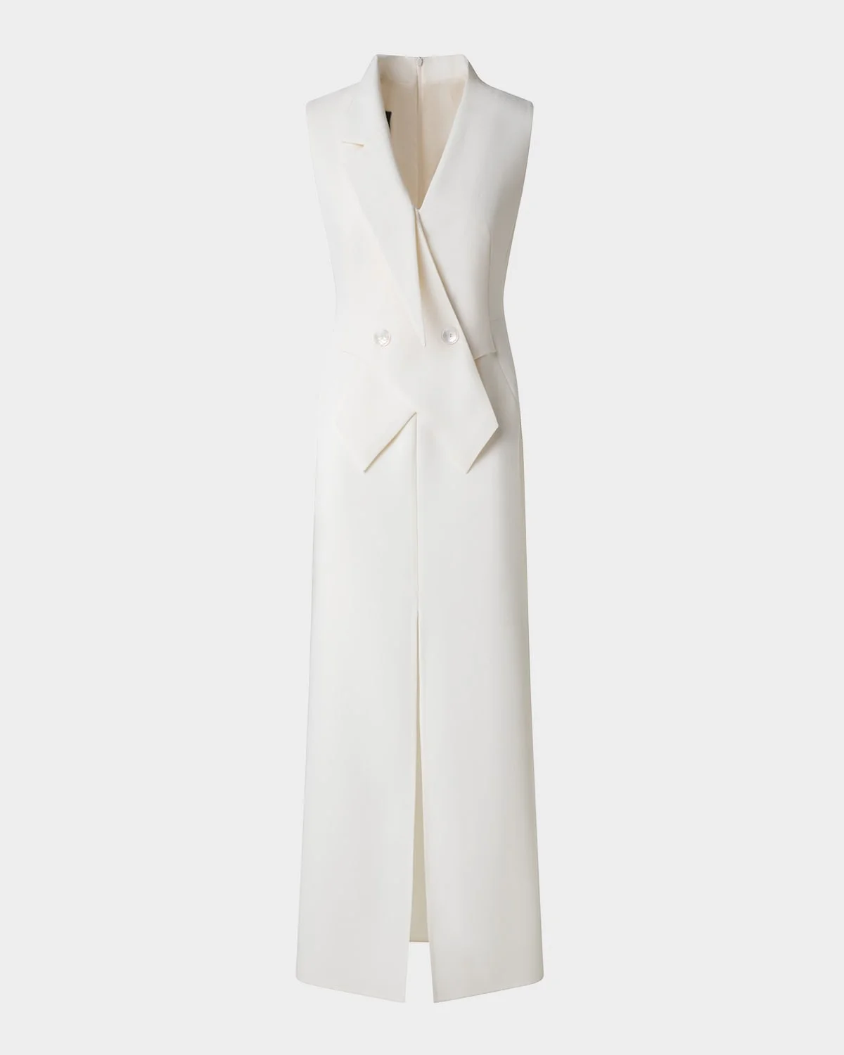 Akris dress crafted from doubleface wool with a front gilet effect V neckline Sleeveless Side seam pockets Centercut front slit Hem falls below the knee Sheath silhouette Invisible back zipper Wool/nylon/polyamide Dry clean Made in Switzerland