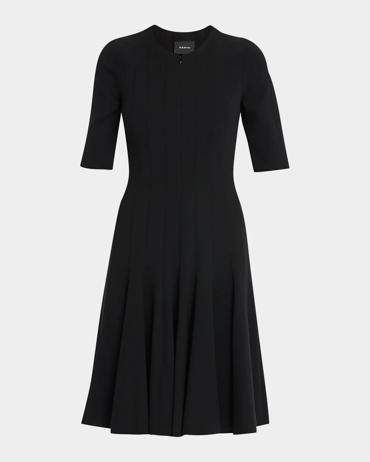 Akris dress in doubleface wool blend. Round neckline; zip front. Elbow sleeves. Nips in at natural waist. Gently pleated skirt. Wool/nylon. Viscose lining. Imported.