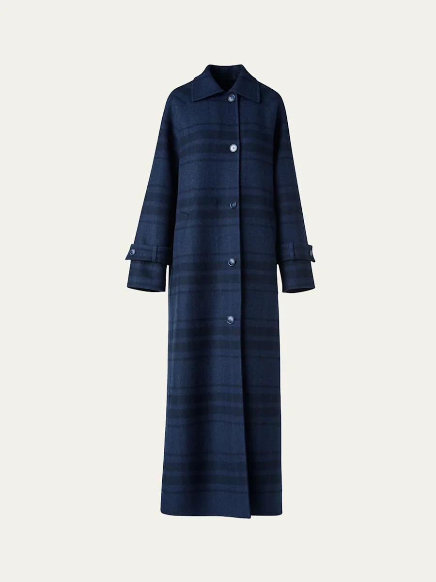 Akris "Estelle" doubleface wool maxi coat in tonal check Point collar Singlebreasted front Long raglan sleeves with belted cuffs Angled side pockets Relaxed fit Walking vent Buttonfront Virgin wool Lining: Cupro Dry clean Imported