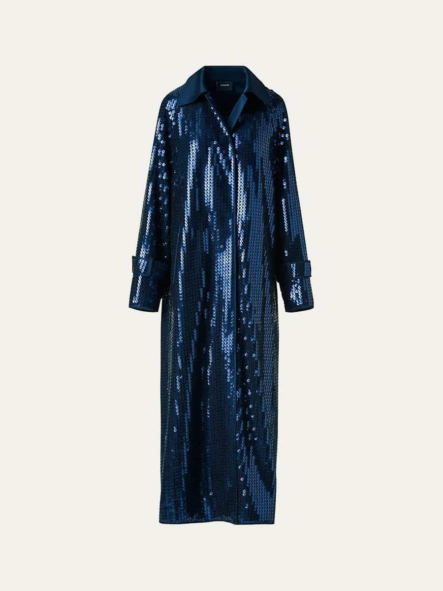 Akris "Estelle" maxi coat presented in translucent sequins on chiffon Silk satin spread collar Long raglan sleeves Side welt pockets Back slit Full length Concealed button front closure Polyester/wool/acrylic Lining: Silk Dry clean Made in Romania Online Inquiries: BGS21_BA4PM| Store Inquiries: #5035711