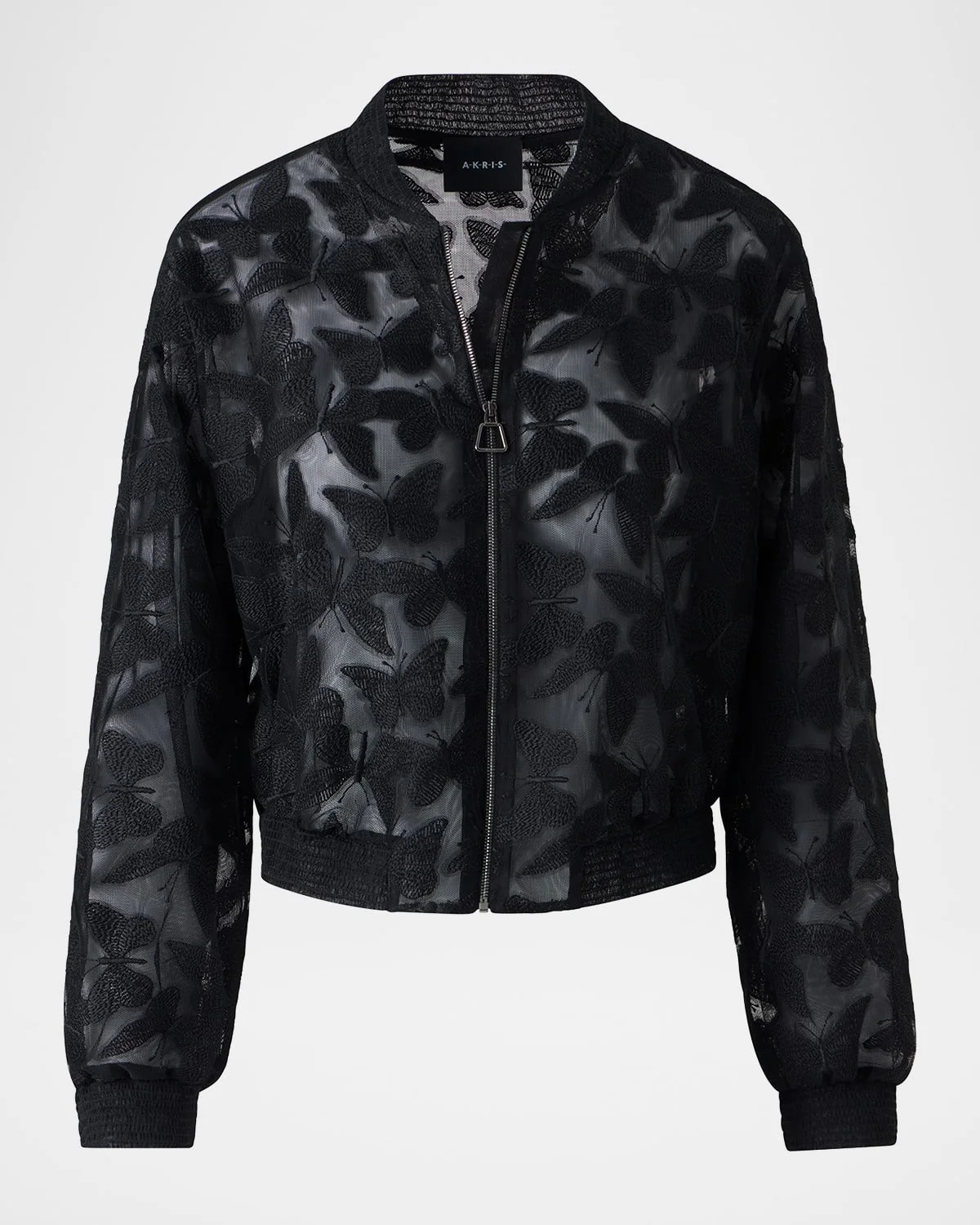 Akris bomber jacket revisits sporty elegance in sheer tulle embroidered with delicate butterflies Baseball collar; zip front Long sleeves Relaxed fit Hip length Elasticized cuffs and hem Polyester Made in Romania