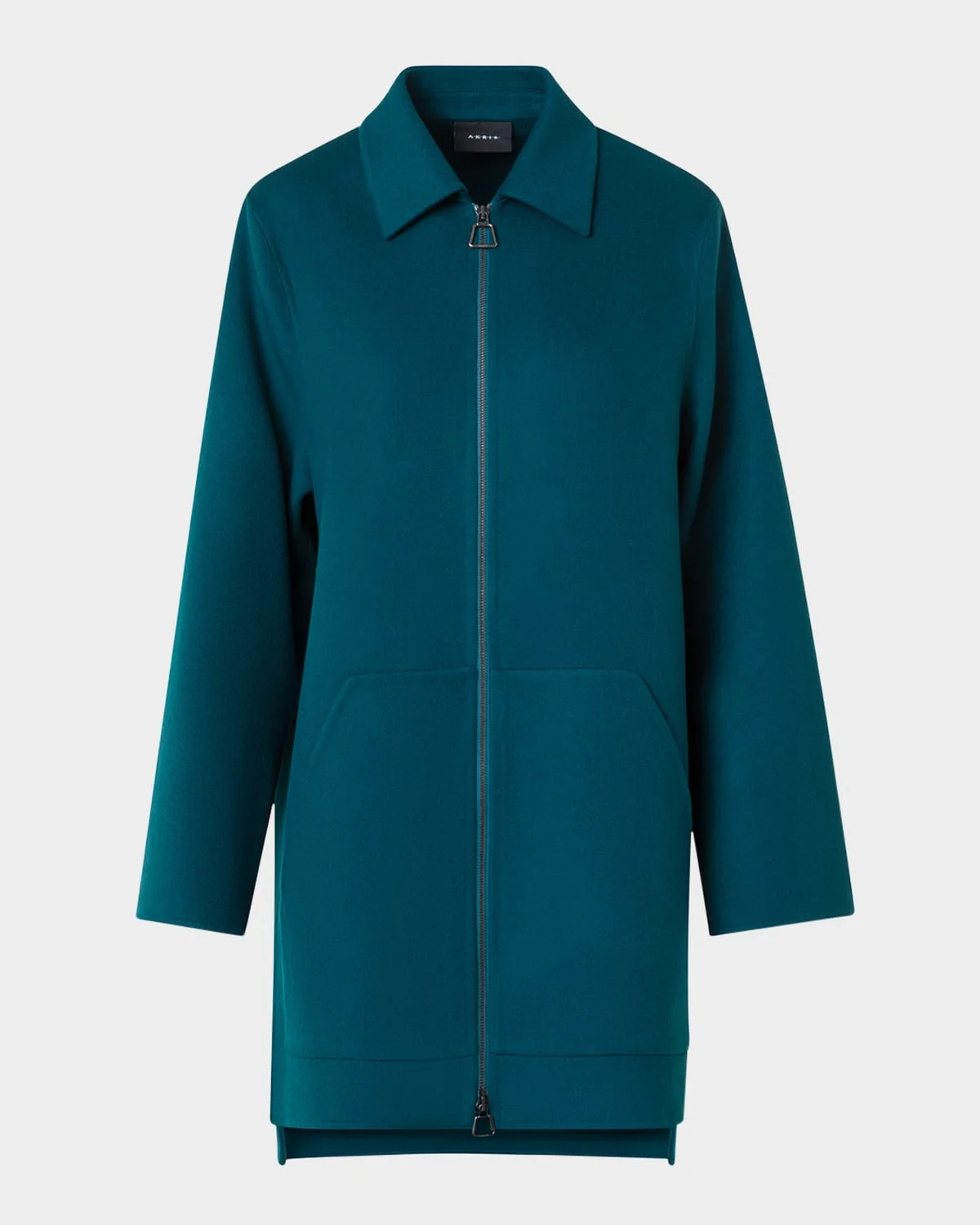 - Akris "Fabiola" coat in double-face cashmere - Shirt collar - Long sleeves - Split kangaroo pouch pocket - Relaxed fit - Mid-length - Two-way front zip closure - Cashmere - Dry clean - Made in Switzerland