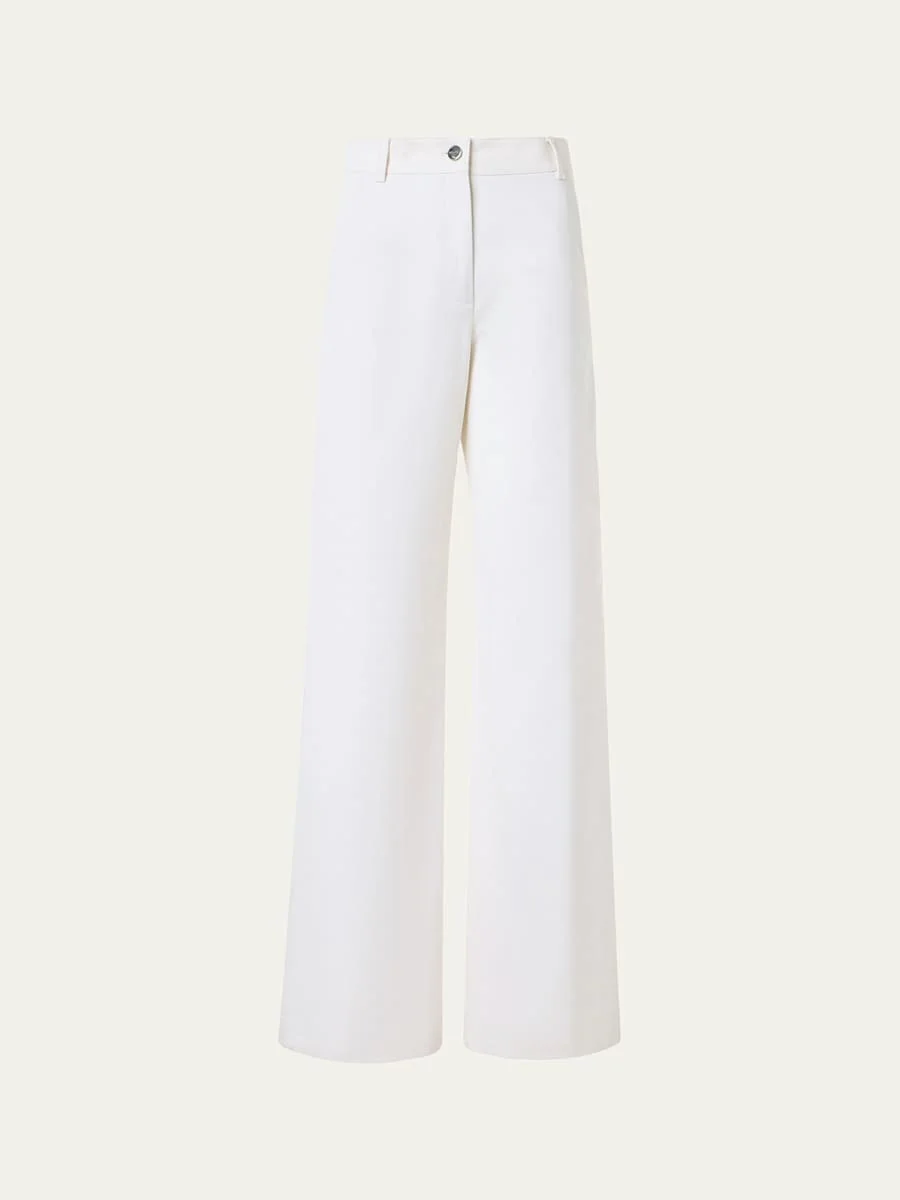 Crafted from white washed denim, the "Finnian" pants from Akris feature signature topstitching on the back pocket and a logoengraved silvertone button High rise Angled side slip pockets Back patch pockets Wide legs Full length Button/zip fly; belt loops Cotton/polyurethane Lining: Cupro Dry clean Made in Romania