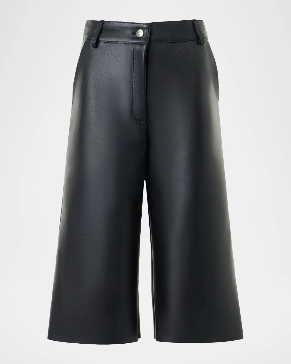 Akris "Finny" bermuda shorts cut from supple lambskin leather and punctuated with a silvertone button Mid rise Belt loop waist Fourpocket style Cropped fit Wide legs Button/zip fly Leather Made in Romania
