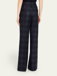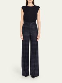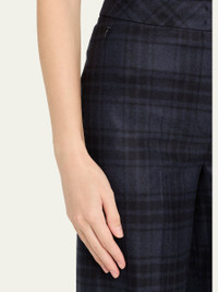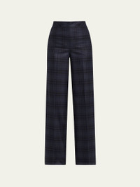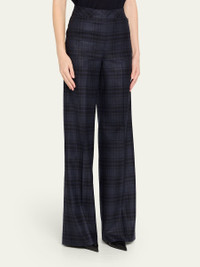Akris "Fior" pants in check wool flannel High rise Side zip pockets Wide legs Full length Hook/zip fly Wool Lining: Cupro Dry clean Made in Switzerland