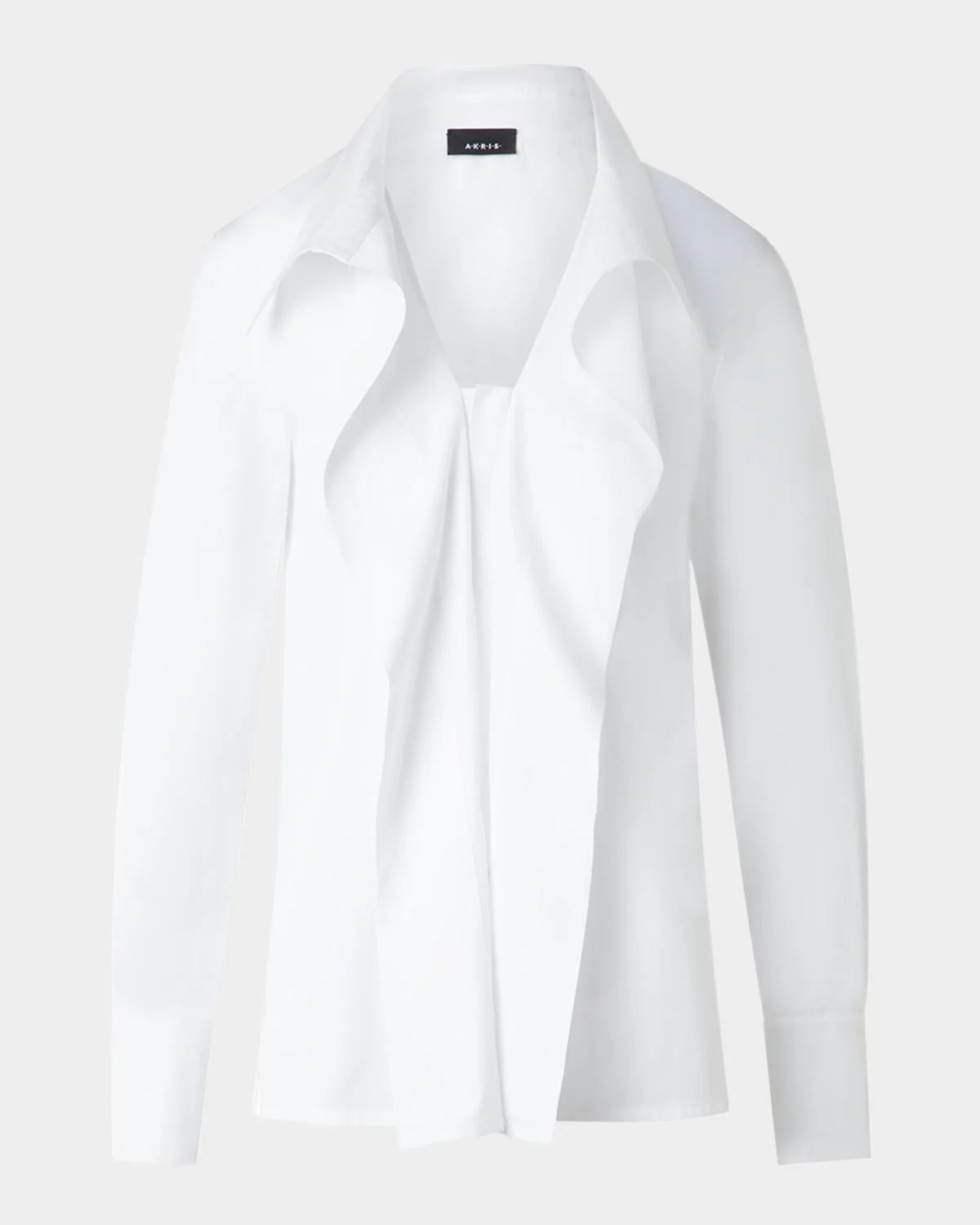 - Akris poplin blouse with a large folding collar and front pleats - V neckline - Long sleeves; button cuffs - Straight fit - Cotton - Made in Romania - Model is 5'10"/177cm.
