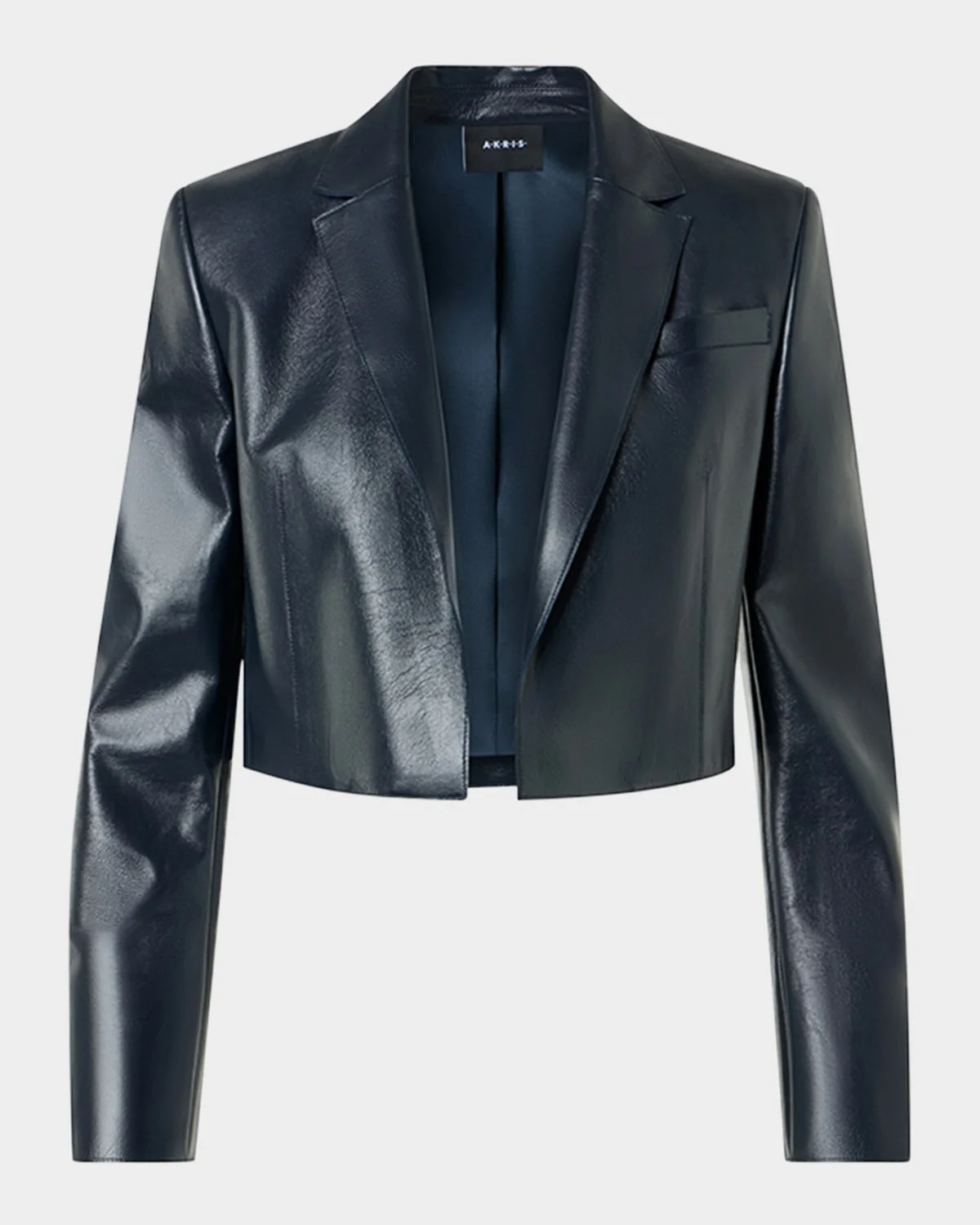 Akris "Gian" short jacket cut from supple, shiny lambskin leather Notched lapels; open front Long sleeves; slit cuffs Padded shoulders Chest welt pocket Shrunken fit Cropped length Leather Made in Romania