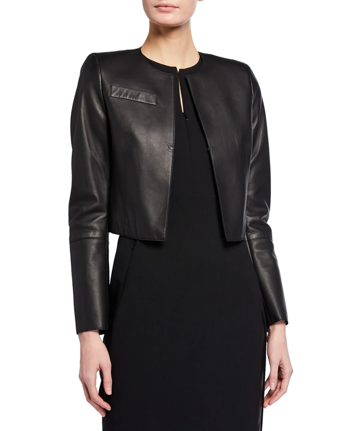 Akris "Hasso" napa leather jacket.Split round neckline.Long sleeves.Welt pocket at right chest.Fitted silhouette.Cropped at waist.Viscose/acetate lining.Made in Spain.