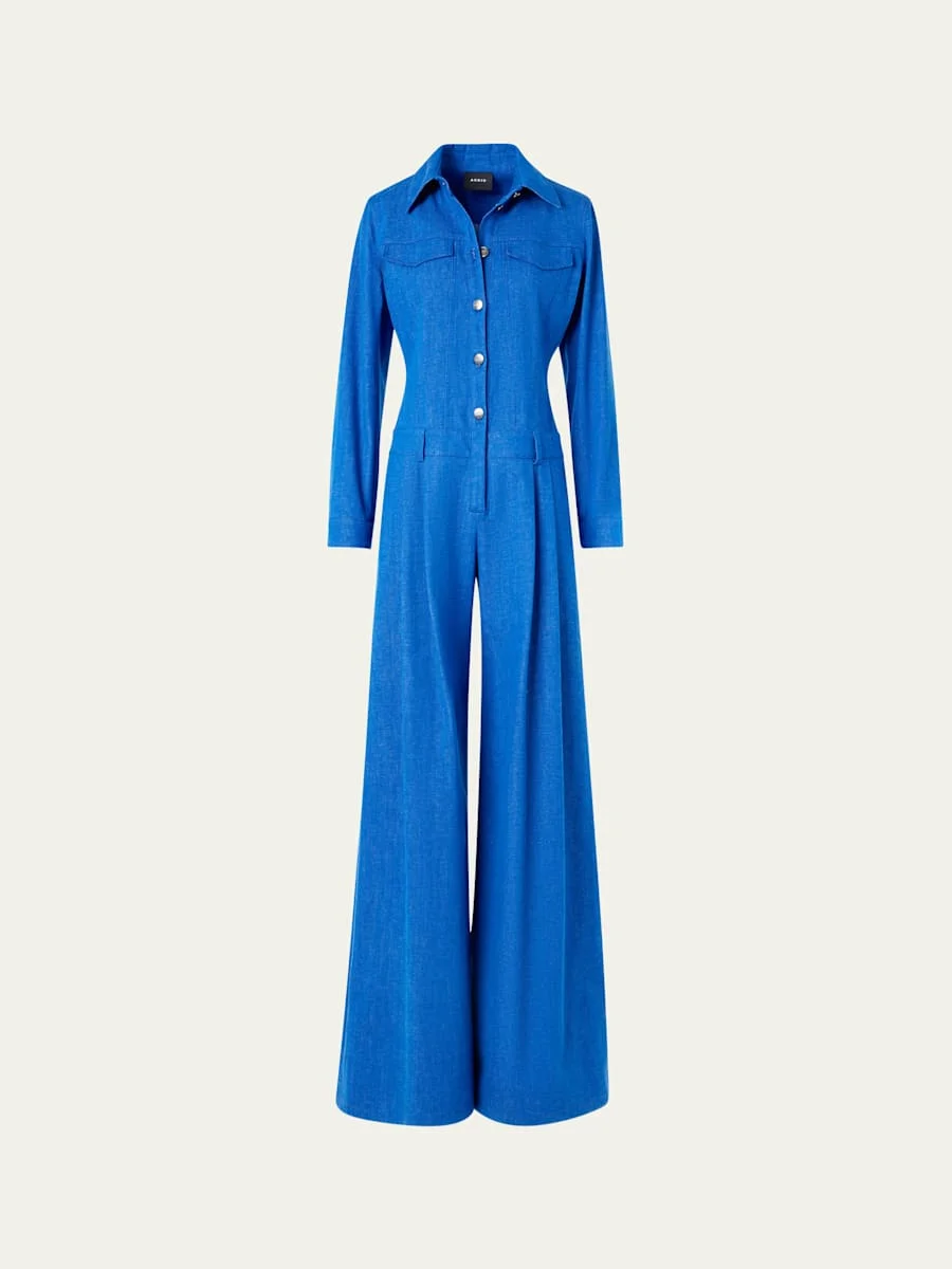 Akris "Hellas" pleated jumpsuit crafted from stretch cotton denim and fashioned with multiple pockets Spread collar Snap button front placket Long sleeves Belt loop waist Side slip pockets; back patch pockets Full length Wide legs Cotton/polyurethane Dry clean Made in Romania