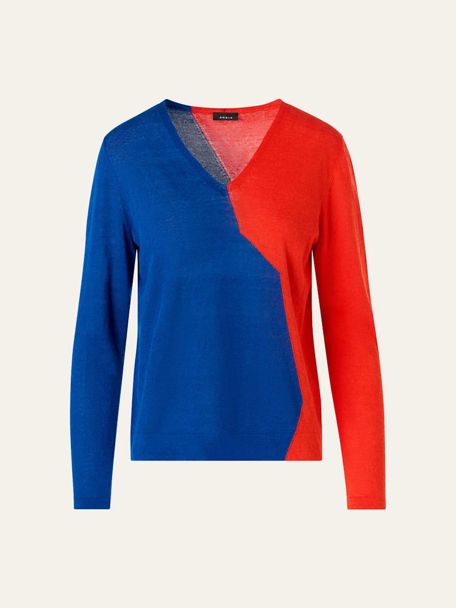 Crafted from linencotton knit, this sweater from Akris features colorblock high plains intarsia V neckline Long sleeves Relaxed fit Hip length Ribbed cuffs and hem Pullover style Linen/cotton Dry clean Made in Romania SIZE amp; FITModel measurements: 5'10" tall Model is wearing a US size 4/Small