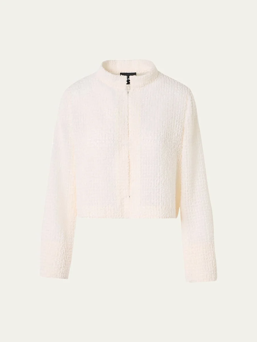 The "Hockney" bolero jacket from Akris is crafted from fringed techno grid Band collar; singlebreasted front Long sleeves; slit cuffs Boxy fit Hip length Straight hem Hookandeye front closure Polyester Lining: Viscose Dry clean Made in Romania SIZE amp; FITModel measurements: 5'10" tall Model is wearing a US size 4/Small
