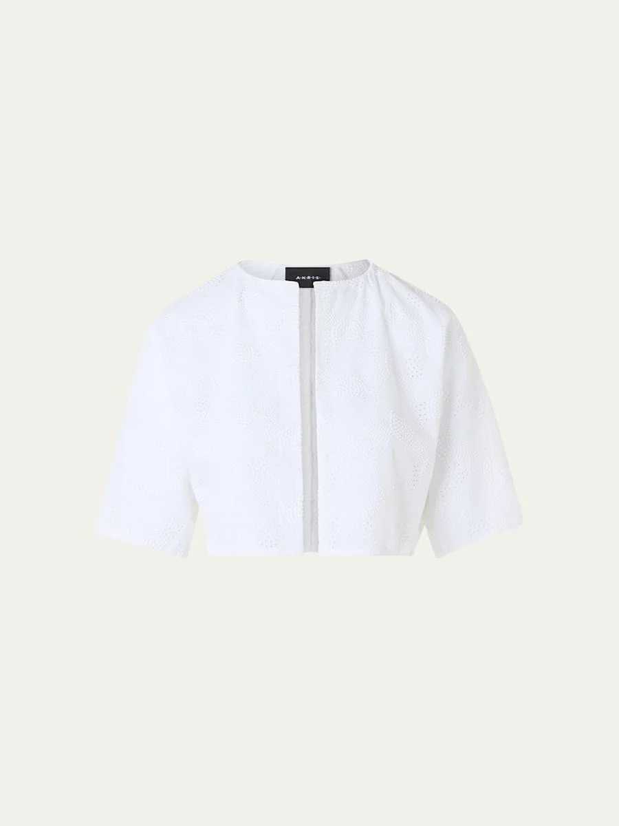 The "Honora" bolero jacket from Akris features is crafted from cotton orbit broderie anglaise with subtle gathering along the back of the neck Round neckline; open front Elbow raglan sleeves Straight fit Cropped length Straight hem Cotton Dry clean Made in Romania SIZE amp; FITModel measurements: 5'10" tall Model is wearing a US size 4/Small