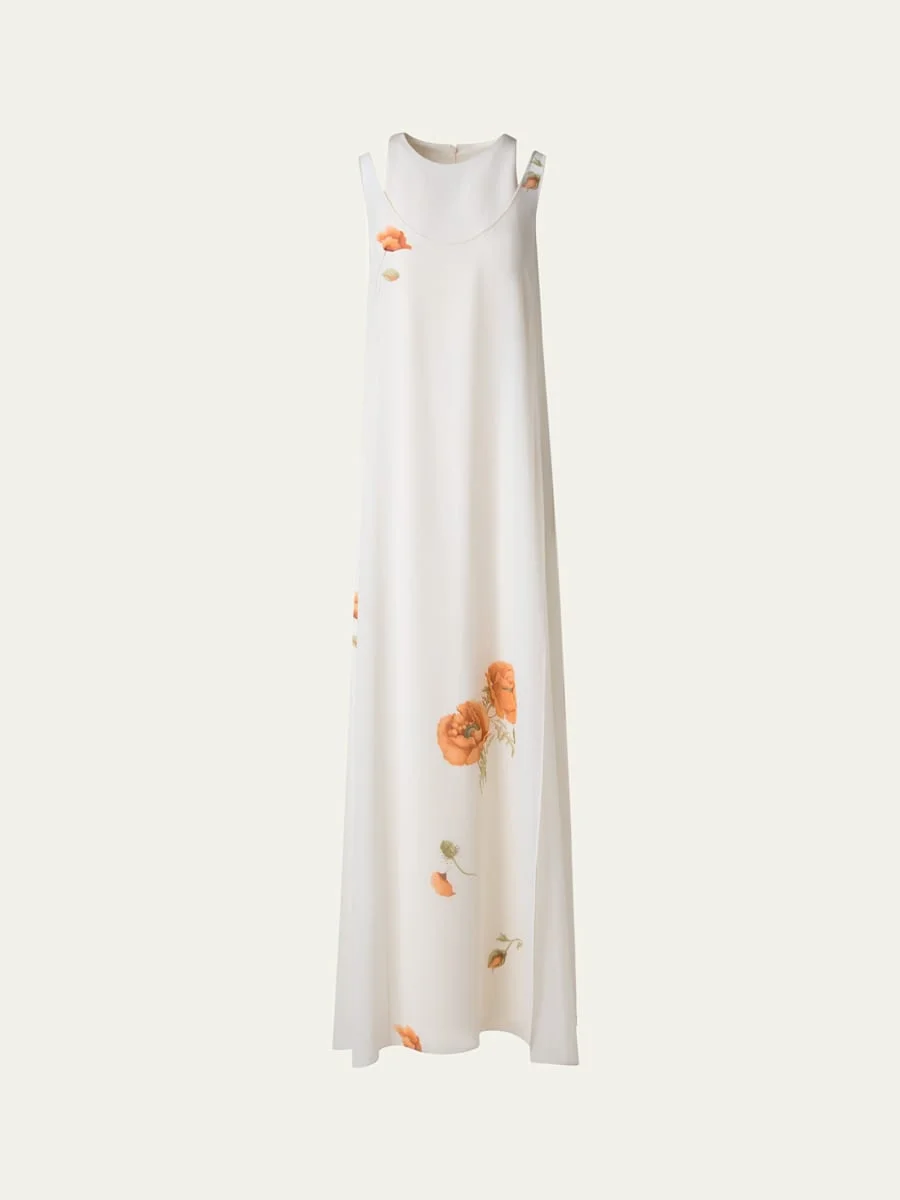 Akris crepe gown in Italian anemone print with a georgette overlayer Round neckline Sleeveless Floor length Loose silhouette Back zip Silk Viscose/silk lining Dry clean Made in Romania Online Inquiries: BGS21_B9QUY| Store Inquiries: #4946603