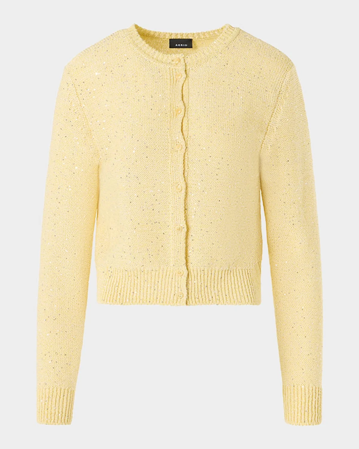 Akris knit cardigan accented with sequins for a subtle spark Crew neckline; button front with scalloped placket Long sleeves Cropped hem Slim fit Linen/polyester/cotton Made in Romania