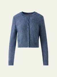 Akris knit cardigan accented with sequins for a subtle spark Crew neckline; button front with scalloped placket Long sleeves Cropped hem Slim fit Linen/polyester/cotton Made in Romania