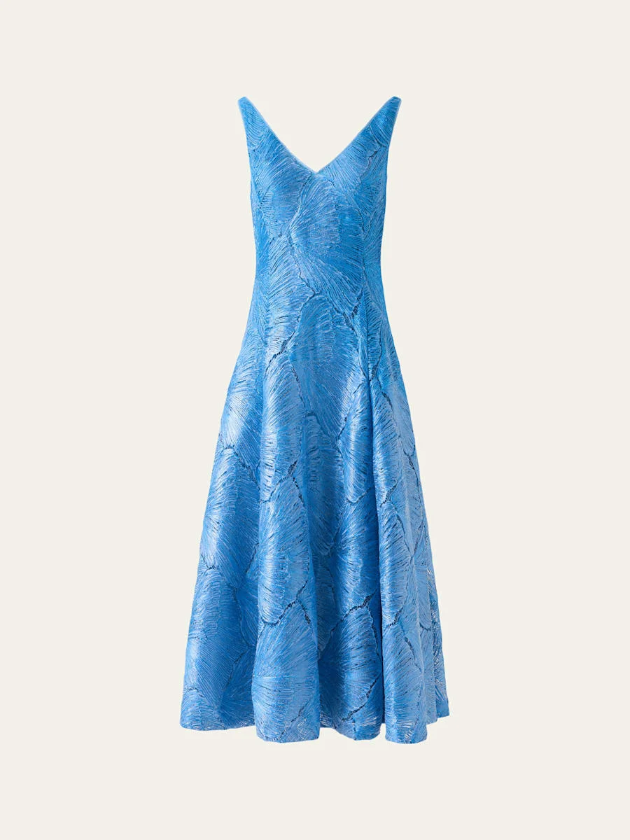 Akris lacquered dress, defined by dimensional texture and a luminous finish inspired by the sea V neckline Sleeveless Hem falls below the knee Aline silhouette Concealed back zip closure Nylon/polyamide Made in Romania