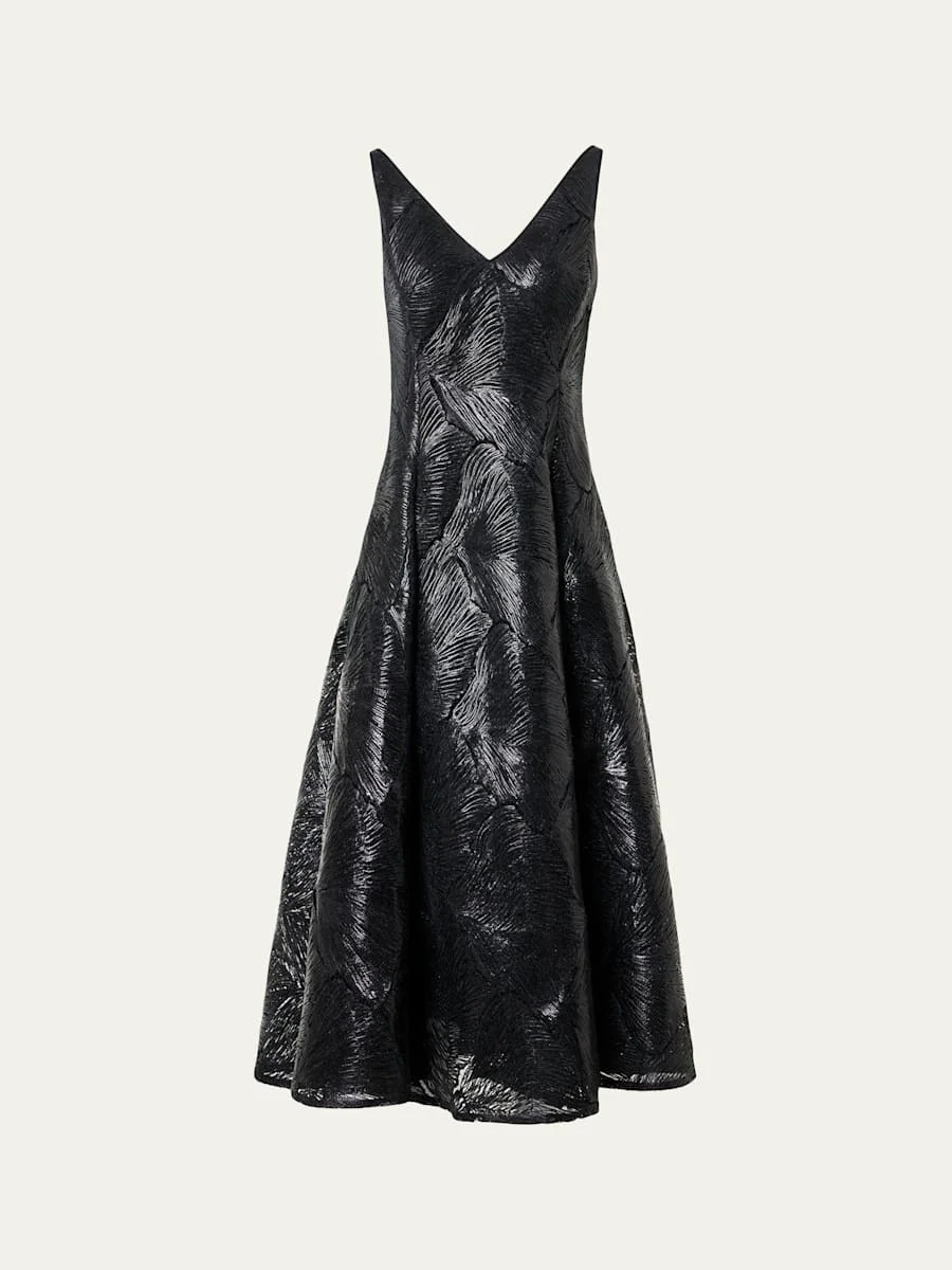 Akris lacquered dress, defined by dimensional texture and a luminous finish inspired by the sea V neckline Sleeveless Hem falls below the knee Aline silhouette Concealed back zip closure Nylon/polyamide Made in Romania