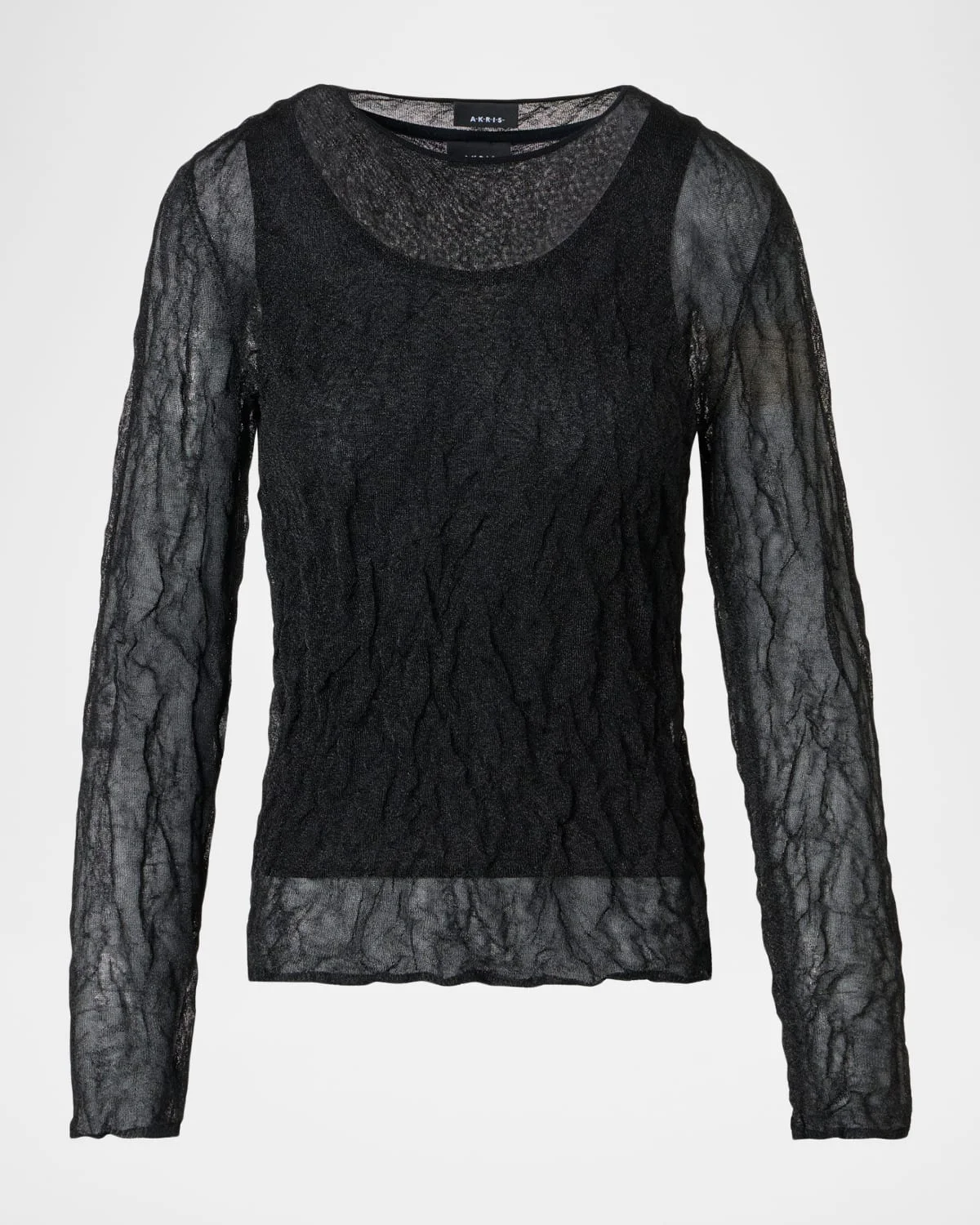 Designed in a crinkled viscose blend, this layered Akris sheer top delivers an airy, avantgarde edge Finished with a soft tank underlayer Crew neckline Long sleeves Pullover style Slim fit Viscose/metallic fibers Made in Romania