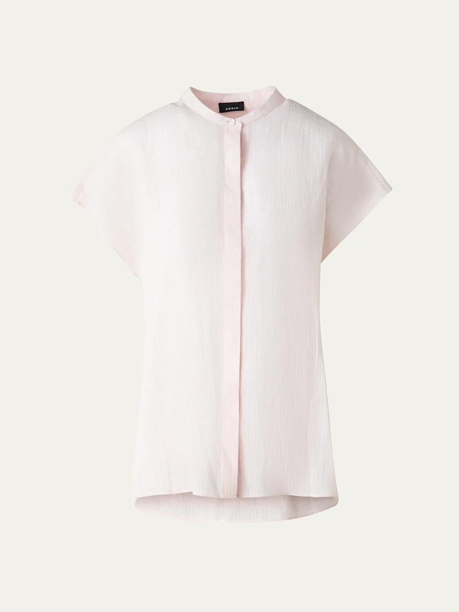 Akris blouse crafted from linen voile Stand collar Cap sleeves Side slits Hip length Shirttail hem Concealed button front Linen Dry clean Made in Romania Online Inquiries: BGS21_B9JZH| Store Inquiries: #4888076