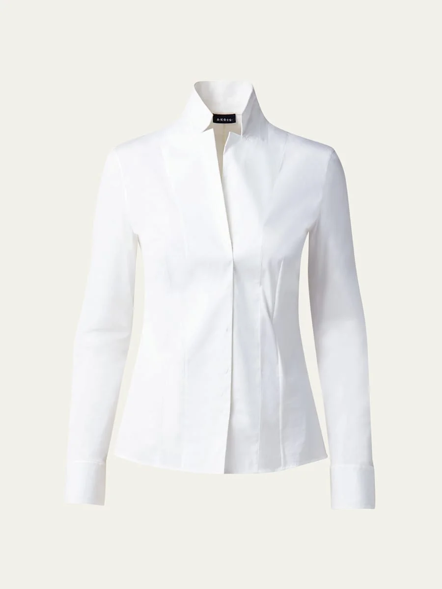 Made from stretch cotton, this blouse by Akris features tonal princess seaming Notched stand collar; concealed front closure Long sleeves; barrel cuffs Regular fit Straight hem Hip length Cotton/spandex Made in Romania