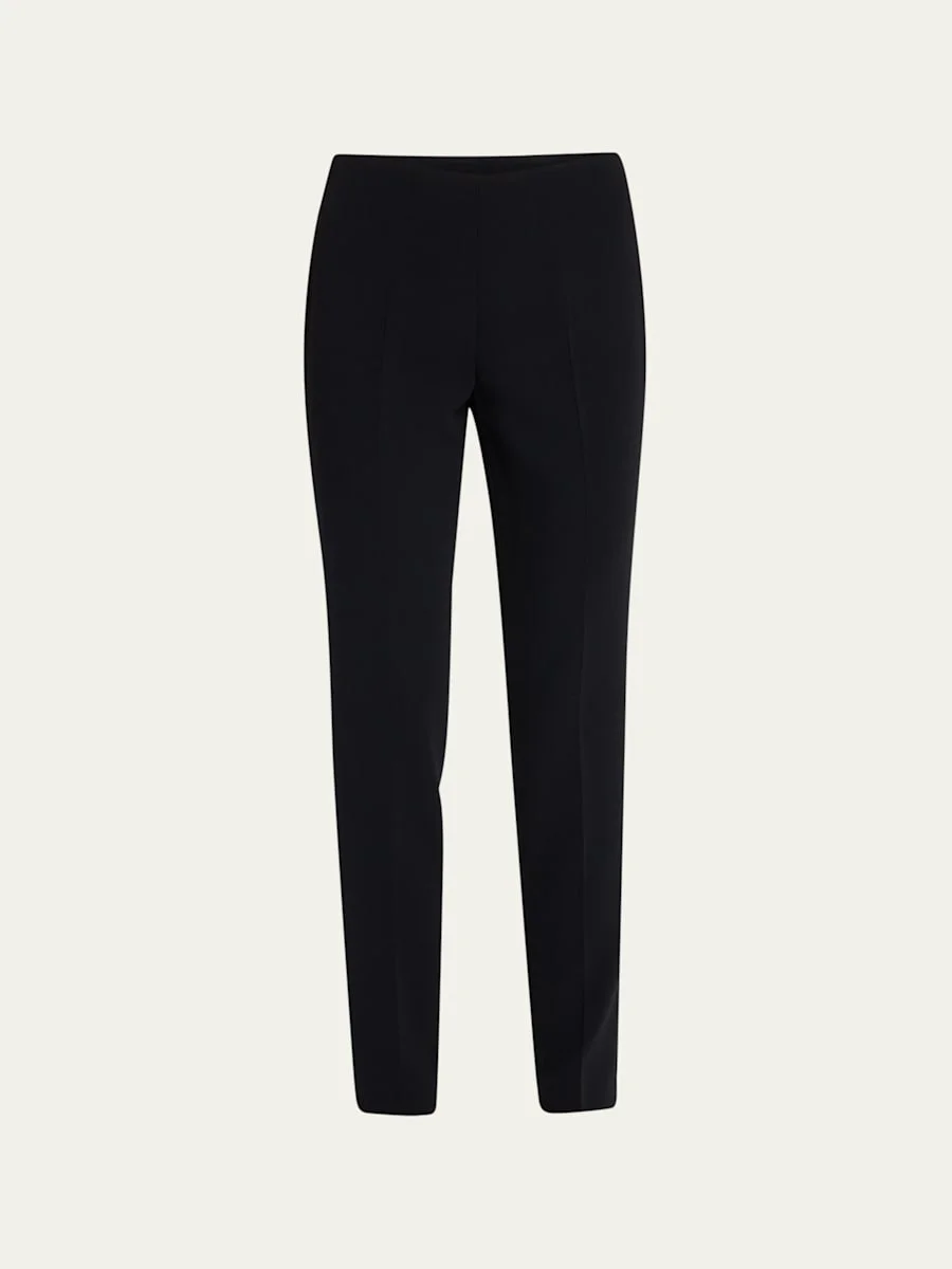 Double-face knit pants by Akris. Approx. measurements: 9.1" rise, 30.5" inseam, 39.5" outseam, 12" leg opening. Waistband sits across hips. Darts contour smooth front. Smooth, fitted legs. Straight hem hits high ankle. Side zip. Wool/nylon. Dry clean. Made in Romania. Model is 5'10"/177cm. Online Inquiries: BGS21_B8MAM| Store Inquiries: #161480